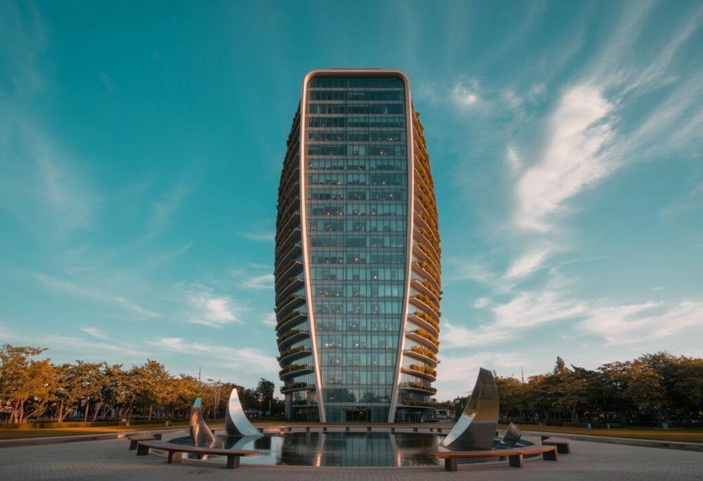 Completed in 2020, Aurora Residences redefines the concept of high-rise living in New York City. Rising gracefully above the East Harbor District, the building merges sleek glass modernism with lush vertical greenery, bringing nature into the urban skyline. Its curvilinear form, designed by VerdeForm Studio, is both a sculptural statement and an environmental innovation.